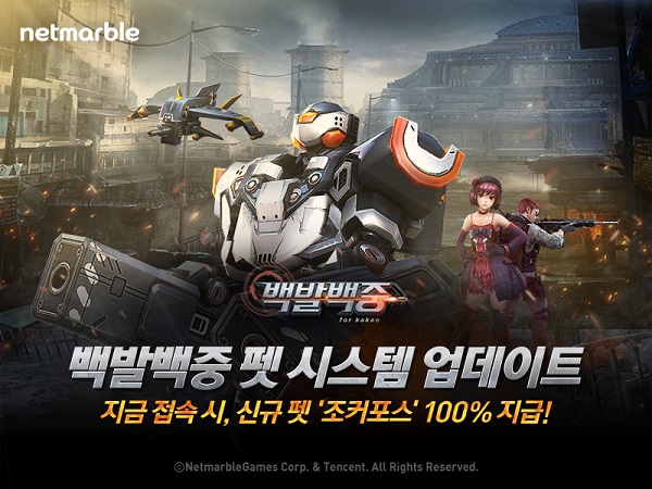[뉴스비전e 장연우 기자] 넷마블게임즈(이하 넷마블, 대표 권영식)는 모바일 FPS 게임 '백발백중 for kako(이하 백발백중)'에서 펫 시스템을 추가하는 업데이트를 실시했다고 29일 밝혔다.