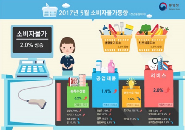 통계청이 1일 발표한 5월 소비자물가동향에 따르면 지난달 소비자물가지수는 작년 동기 대비 2.0% 상승한 것으로 나타났다.