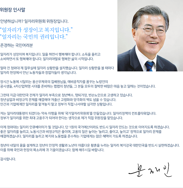 일자리위원회 위원장을 맡은 문 대통령은 일자리위원회 홈페이지의 인사말을 통해 "단 1원의 국가 예산이라도 반드시 일자리 만드는것으로 이어지도록 하겠다"고 강조했다.