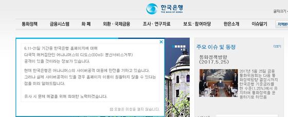 한은은 11일 홈페이지를 통해 "어나니머스가 디도스(DDoS ·분산 서비스 거부) 공격을 할 것이라는 정보가 있다"며 "현재 사이버 공격 대응에 만전을 기하고 있다"고 공지했다.
