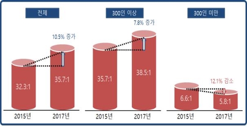 2015년과 비교하면 300인 이상 기업의 취업 경쟁률은 7.8% 상승한 반면 300인 미만 기업은 12.1% 하락했다.