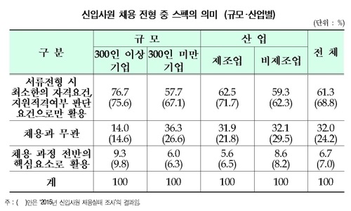 스펙이 채용과 무관하다는 답변은 300인 이상 기업이 14%, 300인 미만 기업은 36.3%였다.