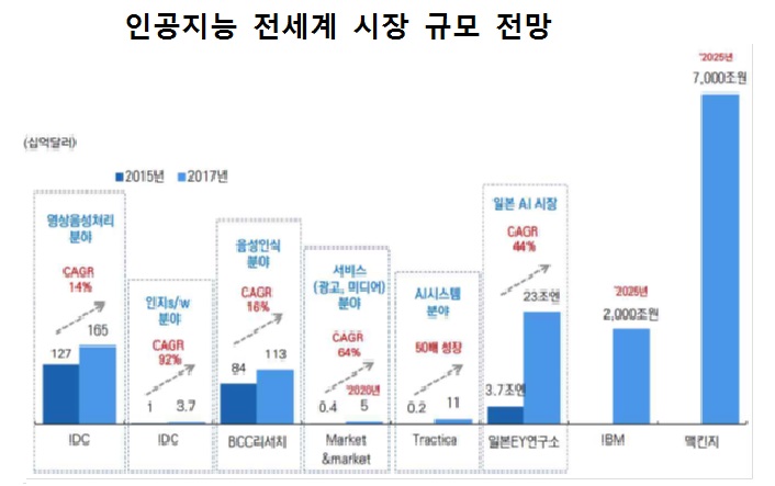 인공지능 분야는 전 세계 적으로 2015년 이후 2020년까지 연평균 82.9% 수준으로 성장이 기대되는 핵심분야이며 우리나라 역시 2030년에 약 27조원 규모 시장으로 확대될 것으로 전망되고 있다.
