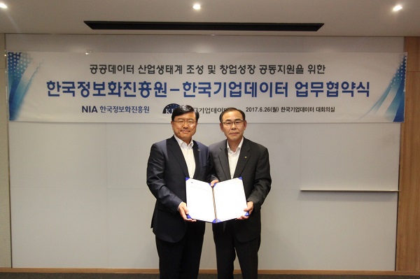 한국정보화진흥원(이하 NIA)과 한국기업데이터(이하 KED)는 26일 여의도 한국기업데이터 본사에서 ‘공공데이터 산업 생태계 조성 및 창업성장 공동지원을 위한 업무협력 양해각서’를 체결했다.