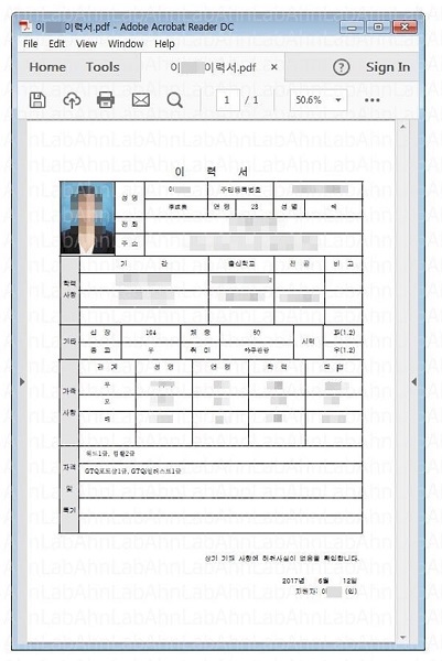 안랩은 이력서 위장 악성코드의 경우, 하반기 취업시즌을 앞두고 공격자는 특정인의 이름을 붙인 이력서로 위장한 PDF 파일을 유포하고 있다고 밝혔다.