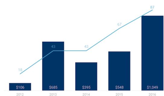 CB인사이츠에 따르면, 지난해 자동차 기술 벤처기업에는 10억4900만달러가 투자됐다. 이들 기업에 투자된 건수는 87건으로 지난 2015년 대비 투자금 규모만 91% 증가했다.