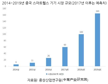 코트라는 "고령화 가속화되고 스마폰 보급이 늘어나면서, 중국의 스마트헬스스 기기 시장 규모는 2014년 6억 위안에서 2016년 26억 위안으로 3년새 4배 이상 성장했다"고 밝혔다.