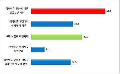 ‘4대 보험료 지원확대’(42.2%), ‘최저임금 인상기업 세제혜택 제공’(34.6%), 최저임금 인상분 하도급 납품단가 제도적 반영(32.5%) 순으로 나타났다.
