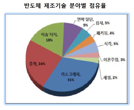 그 뒤로 증착기술(24%), 이송・지지기술(18%), 연마・절단기술(9%), 검사기술(5%), 식각기술(5%), 패키징기술(4%), 이온주입기술(3%), 세정기술(2%) 순인 것으로 조사됐다.