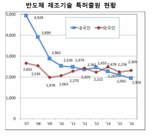 특허청이 최근 10년간(2007년~2016년) 반도체 제조기술 관련 특허출원동향을 분석한 결과, 그 특허출원건수가 2007년 7천 583건에서 2016년 4천 241건으로 지속적으로 감소한 것으로 집계됐다.