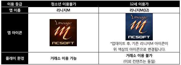 기존에 출시한 리니지M 앱은 ‘리니지M(12)’로 이름을 변경해 서비스를 유지한다는 설명이다.