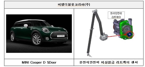 먼저, MINI Cooper D 5Door 등 10개 차종 720대에서는 차량의 움직임을 감지해 위급상황에서 좌석안전띠가 풀어지지 않게 잠그는 기능을 하는 운전석 안전띠 비상잠금 리트랙터 내부의 센서가 제대로 작동하지 않아, 안전띠가 잠기지 않거나 잠금시점이 늦어져 운전자가 상해를 입을 가능성이 있는것으로 나타났다.