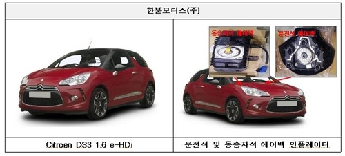 한불모터스에서 수입해 판매한 시트로엥 DS3 1.6 e-HDi 등 10개 차종 781대는 사고시 에어백인플레이터의 과도한 폭발압력으로 발생한 내부 부품의 금속 파편이 운전자 등에게 상해를 입힐 가능성이 발견됐다.