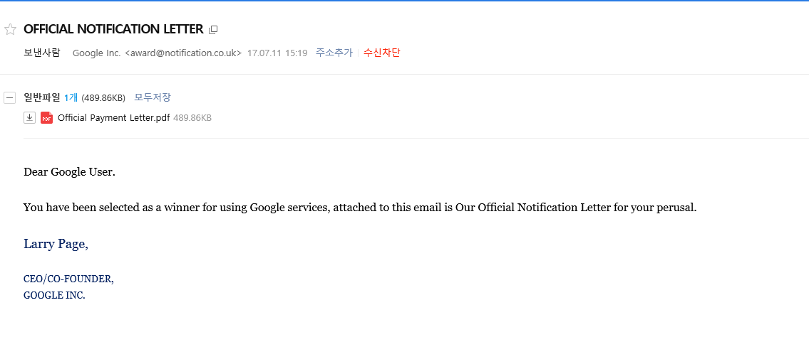 이미 몇 년 전부터 온라인 상에서 구글 복권 당첨을 빌미로 제3자의 개인 신상 및 금융 정보를 빼내는 수법으로 악명이 높다.