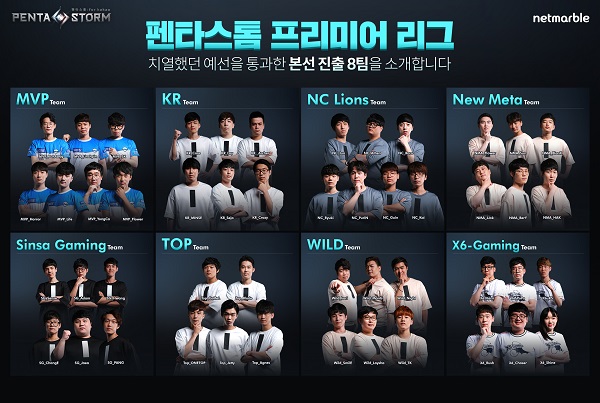 오는 23일부터 매주 일요일 오후 7시 게임 전문채널OGN을 통해 생중계 되는 ‘펜타스톰 프리미어 리그’는 A조에 ‘WILD’, ‘SINSA GAMING’, ‘KR’, ‘NC Lions(구 Hash Tag)’, B조에 ‘MVP’, ‘New MetA’, ‘X6-Gaming’, 그리고 ‘TopTeaM’이 각각 듀얼 토너먼트로 경기를 진행한다. 1 라운드 첫 방송에서는 ‘WILD’가 ‘NC Lions’를 상대하게 되고 ‘SINSA GAMING’이 ‘KR’을 상대한다.