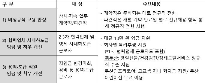 주요 내용은 ㈜두산과 두산인프라코어의 계약‧파견직 근로자의 정규직 전환과 협력업체‧영세