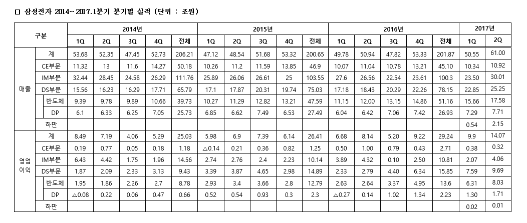 2분기 실적은 메모리 시황 호조가 지속되고, 갤럭시 S8·S8+의 글로벌 판매 확대로 매출이 전년 동기 대비 20% 늘어난 61조원을 기록했다. 영업이익도 부품 사업에서 이익이 대폭 증가해 전년 동기 대비 5.92조원 늘어난 14.07조원, 영업이익률 23.1%를 달성했다.