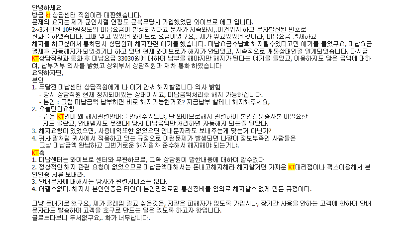 모든 것을 다 차치하고 해지를 요청하려면. KT 미납관리 담당 과장은 "가입 해지를 원하시면 미납급부터 해결을 하셔야 합니다"라고 단호히 대답한다. 이후 가타부타 설명은 없다.
