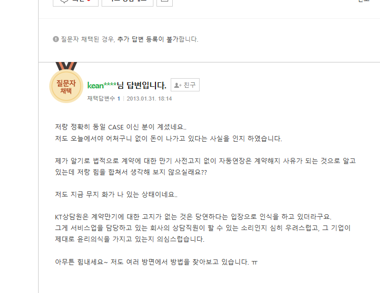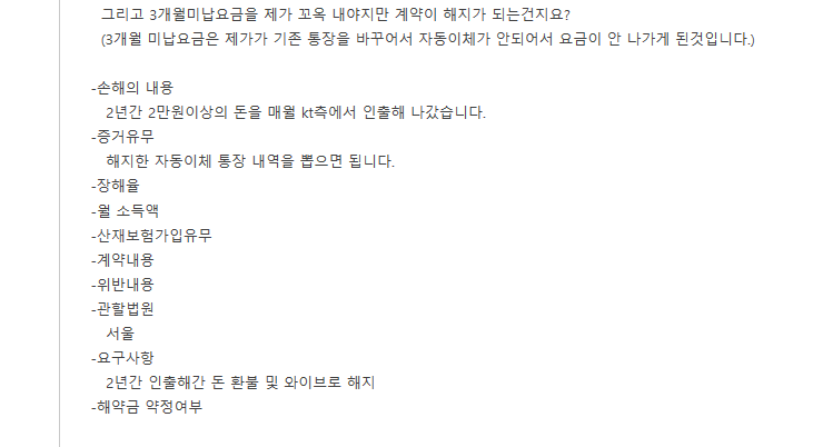자동이체를 통해 요금이 빠져 나가는 줄도 몰랐다는 이용자들의 글을 통해 볼 때, 해지요청의무 혹은 해지요청에 대한 성실한 반영 의무 등을 차지하고, 이용하지도 않은 상태에서 KT가 미리 알려줬다면 사용 의사가 없었다는 점은 확실해 보인다.