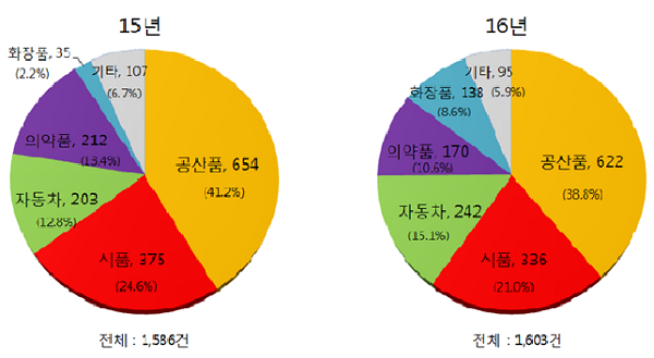 주요 품목별로는 일반 공산품 리콜이 전체 리콜의 38.8%인 622건으로 가장 많았다. 식품 336건(20.9%), 자동차 242건(15.1%), 의약품(한약재 포함) 170건(10.6%), 화장품 138건(8.6%) 등의 순이었다.