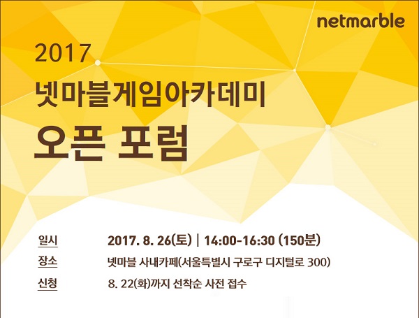 [뉴스비전e 장연우 기자] 넷마블게임즈(이하 넷마블, 대표 권영식)는 ‘넷마블게임아카데미 오픈포럼’ 참가자를 오는 22일까지 모집한다고 9일 밝혔다.