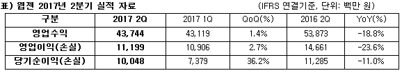 [뉴스비전e 장연우 기자] 웹젠(대표 김태영)이 2분기 실적은 영업수익 437억원으로 전분기(2017년 1분기) 대비 1.4% 증가했다고 10일 밝혔다.