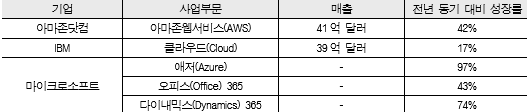 반면, 아마존, MS, 구글의 3개사를 제외하면 나머지 업체들의 실적은 시장 평균에 미치지 못하고 있다.
