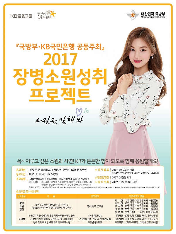 [뉴스비전e 이진구 기자] KB국민은행(은행장 윤종규)은 지난 16일부터 다음달 말일까지 군 장병 대상 소원실현 프로그램인 '2017 장병 소원성취 프로젝트'의 사연을 응모 받는다고 18일 밝혔다.
