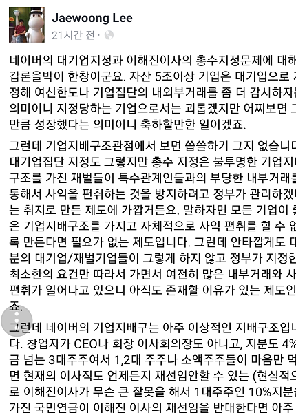 이재웅 창업자는 전날 오후 게재한 개인 페이스북 글에서 "네이버는 이해진 창업자(전 의장)가 마음대로 할 수 없는 이상적인 지배구조"라며 "정부는 이런 지배구조를 스스로 만든 기업을 대기업 지정이나 총수 지정을 하지 않음으로써 다른 기업이 지배구조 개선을 할 요인을 강화할 필요가 있다"고 주장했다.