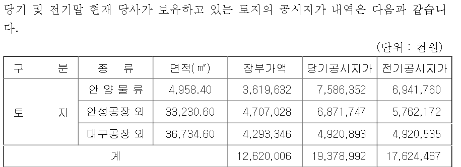 태경농산의 경우 부동산은 경기도 안양 물류시설 및 안성의 2곳(안성공장 / SD공장) 공장, 그리고 대구 공장이다.