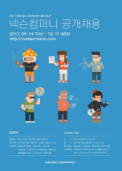[뉴스비전e 장연우 기자] 글로벌 게임기업 넥슨 컴퍼니에서 14일부터 10월 11일까지 2017년도 하반기 신입 및 경력사원을 모집한다 .