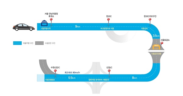 SK텔레콤은 시험 주행을 위해 지난 보름간(9/6~9/20) 만남의 광장 휴게소~수원신갈IC 구간을 50여차례 왕복 주행하며, 자율주행차에 내장된 인공지능이 코스의 차선, 표지판 등을 학습할 수 있도록 준비했다.