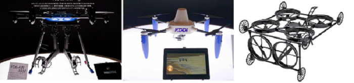 KDDI 는 ‘16.12월에 세계 최초의 직접 작업할 수 있는 로봇 팔이 있는 드론 , 수중의영상을 촬영할 수 있는 방수형 드론 , 교량 등의 대상물 검사를 실시할 인프라 검사 드론 등을 공개 했다.