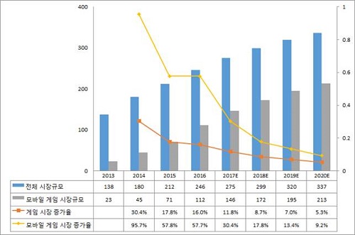 이러한 성장세에 힘입어 2017년에는 275억 달러로 11.8% 증가할 것으로 예측, 스마트폰 게임시장은 146억 달러, 2018년에는 172억 달러까지 증가할 것으로 예측되고 있다.