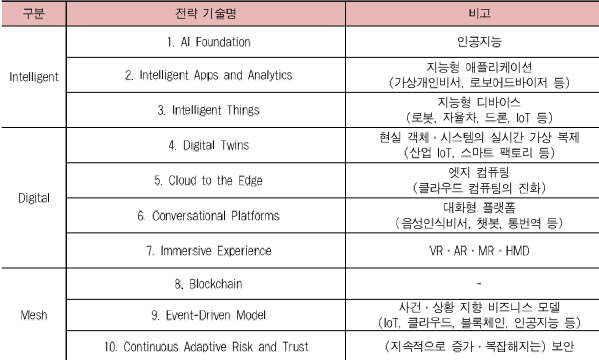 가트너는 이 기술들이 미래 디지털 비즈니스와 에코시스템을 뒷받침하는 근간이 될 것으로 예측하면서, 전략적 방향에 해당하는 인텔리전트, 디지털, 메시 등 3개의 카테고리에 따라 각 영역별 세부 기술을 선정했다.