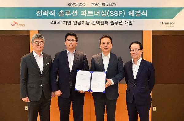 SK㈜ C&C(사업대표:안정옥)는 23일 경기도 성남시 분당 사옥(SK u-타워) 27층 비전룸(Vision Room)에서 이문진 Aibril사업본부장과 한솔인티큐브㈜(대표이사:박상준)의 이종민 CRM사업본부장 등 10여명이 참석한 가운데 ‘Aibril(에이브릴) 기반 인공지능 컨택센터 솔루션 개발을 위한 전략적 솔루션 파트너십(SSP, Strategic Solution Partner) 계약’을 체결했다.