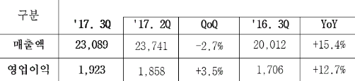 통상 3분기는 과거 3년간을 놓고 볼 때 계절적인 요인으로 인해 매출액이 2분기에 비해 줄어 드는데 올해의 경우 직전 분기대비 매출은 2.7% 소폭 감소했음에도 영업이익은 3.5% 늘어난 실적을 보였다.