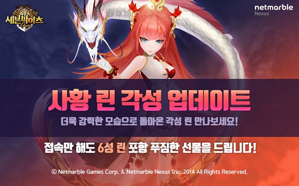 [뉴스비전e 장연우 기자] 넷마블게임즈(이하 넷마블, 대표 권영식)는 모바일 RPG(역할수행게임) '세븐나이츠(개발사 넷마블넥서스)'에서 사황 '린' 각성 업데이트를 실시했다고 26일 밝혔다.
