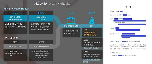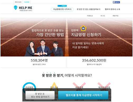 의뢰인이 채무 지급과 관련된 사실관계를 입력하면 그에 따른 법률적 효과를 파악해 알고리즘을 통해 적법한 지급명령신청서를 자동으로 작성 · 제공하는 '지급명령 헬프미'는 서비스 시작 이후 일주일만에 500건 사전예약, 1천건 이상의 실제 사건을 처리했다.