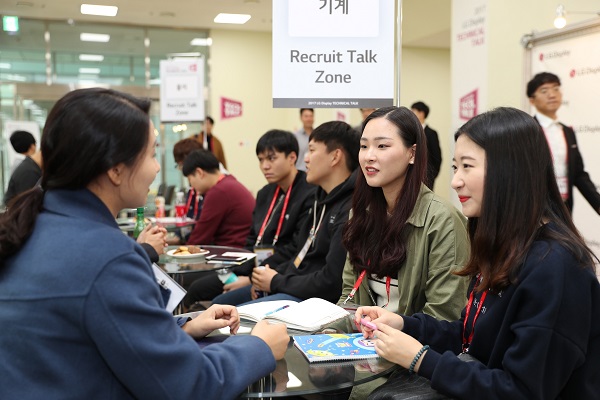 LG디스플레이(대표이사 부회장 한상범)는 2일 파주사업장에서 CEO 한상범 부회장, CTO 강인병 전무 등 주요 경영진이 직접 나서 19개 대학 이공계 학생, 교수 등 500여명을 초청, 이색채용설명회 ‘테크니컬 톡’(Technical Talk)을 개최했다고 밝혔다.