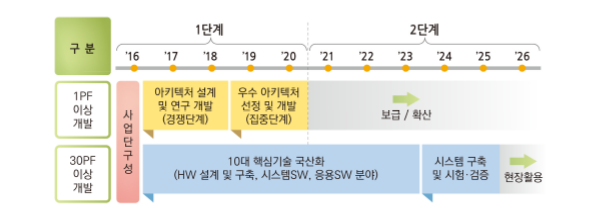 기간별로는 2016~2020년까지 1페타플롭 이상, 2021~2025년 30페타플롭스 이상 규모의 슈퍼컴퓨터로 단계적 개발에 중점을 뒀다.