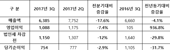 2017년 3분기는 신규 매출원의 부재로 전년동기대비 매출액 -4.1%, 당기순이익 -31.7%, 전분기대비 매출액 -17.6%, 영업이익 -7.4%, 당기순이익 -2.9% 하락했다.