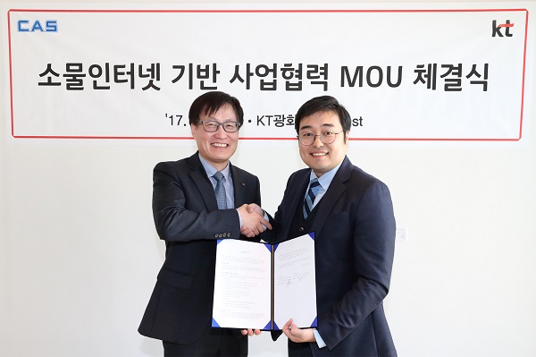 [뉴스비전e 정윤수 기자] KT(회장 황창규)와 전자저울 업체 카스(이하 카스, 대표 김태인)는 14일 KT 광화문빌딩 East 사옥에서 NB-IoT를 적용한 제품 및 서비스 개발을 추진하기 위해 ‘소물인터넷 사업협력을 위한 업무협약(MOU)’을 체결했다고 14일 밝혔다.