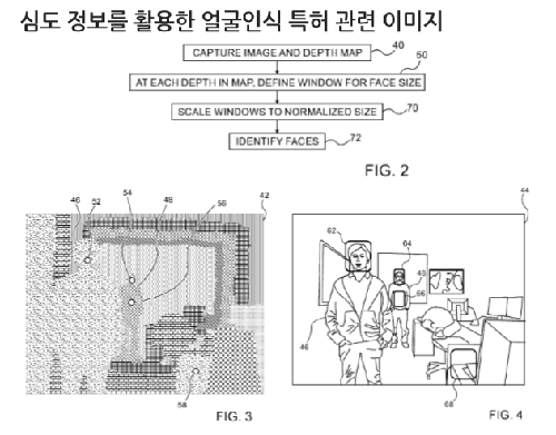한편, Apple은 2017년 3월 ‘심도 정보를 활용하는 기능이 향상된 얼굴인식 시스템(Enhnaced Face Detection Using Depth information)’ 특허를 획득했다. 특허 내용은 심도인식이 가능한 3D 카메라를 활용해 이미지와 함께 심도 맵(depth map)을 캡쳐한 후 이미지 내 개별 심도에서 사람의 얼굴을 찾은 후 얼굴인식을 위한 창의 크기를 정하고, 먼 거리에 있는 사람의 경우 얼굴인식용 창의 크기를 일반 크기로 확장한 후 DB와 비교해 얼굴을 인식하는 것이 핵심이다. 아울러, 동일한 방법을 얼굴인식뿐만 아니라 객체인식에도 적용이 가능하다고 특허에 언급되어 있다.