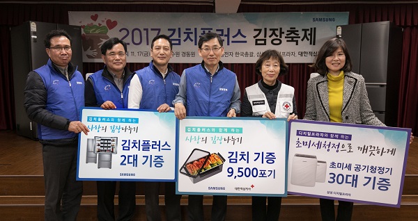 삼성전자는 이날 담근 김치 800포기와 프리미엄 김치냉장고 ‘김치플러스’ 2대, 블루스카이 공기청정기 30대를 ‘경동원’에 기증했다. 나머지 8700포기의 김치는 전국의 취약계층 3000세대에 전달될 예정이다.
