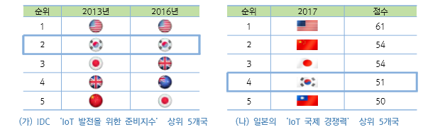 반면 일본 정부의 사물인터넷 역량을 측정하기 위해, 자체 신규 지표로 조사한 ‘IoT국가 경쟁력 순위'에서 한국은 미국, 중국, 일본에 이어 4위를 기록했다. 일본 총무성의 집계 자료이긴 하지만, 원천 기술력을 반영해 한국보다 일본이 우위에 있다고 평가한 대목은 주목할만하다.