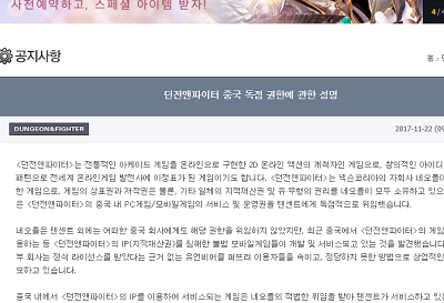 ◆이하 넥슨이 던전앤파이터 홈페이지에 공개한 '중국 독점 권한에 관한 성명' 전문