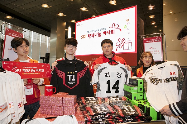 [뉴스비전e 이진구 기자] SK텔레콤(대표이사 사장 박정호)은 지난 25일 을지로 사옥에서 자사의 e-스포츠단인 ‘T1’과 야구단 ‘SK와이번스’ 선수들의 참여 속에 스포츠 스타들의 기증품과 사회적 기업의 제품들을 판매하는 행복나눔바자회를 개최했다고 밝혔다.