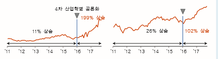 반도체 장비 주요 기업인 어플라이드머티리얼즈 (Applied Materials/AMAT)의 주가는 2011년부터 2015년까지 약 11% 상승에 그쳤으나, ‘4차 산업혁명’이 공론화 된 2016년 이후부터 현재(2017년 11월)까지 약 199% 급등했다.
