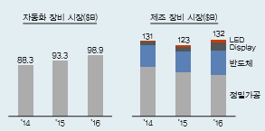 제조 장비 시장은 반도체, 디스플레이, 전지, 정밀가공 장비 등으로 제조 산업마다 다양하게 구성되어 있다. 시장규모는 지난 2014년 1310억 달러 시장에서 2016년 1320억달러로, 시장 자체의 성장성만 보면 크지 않지만 관련 기업들의 이익률이 높은 시장으로 평가된다.